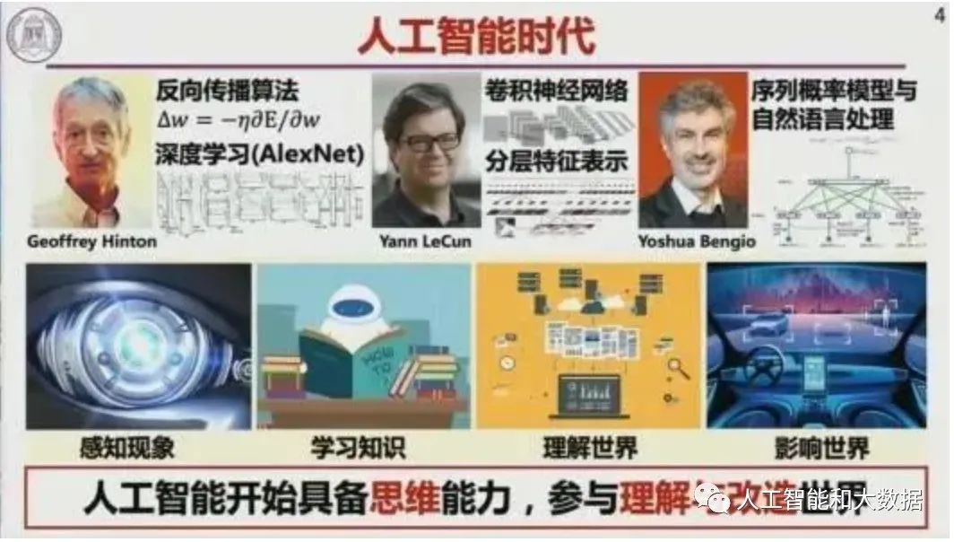 人工智能時代出現(xiàn)了三位深度學習的奠基人,也是2019年的圖靈獎獲得者。第一是Geoffrey Hinton(杰弗里?辛頓),反向傳播算法的代表人物;第二是Yann LeCun(楊立昆),卷積神經(jīng)網(wǎng)絡(luò)的代表人物;第三是Yoshua Bengio(約書亞?本吉奧),序列概率模型的代表人物。