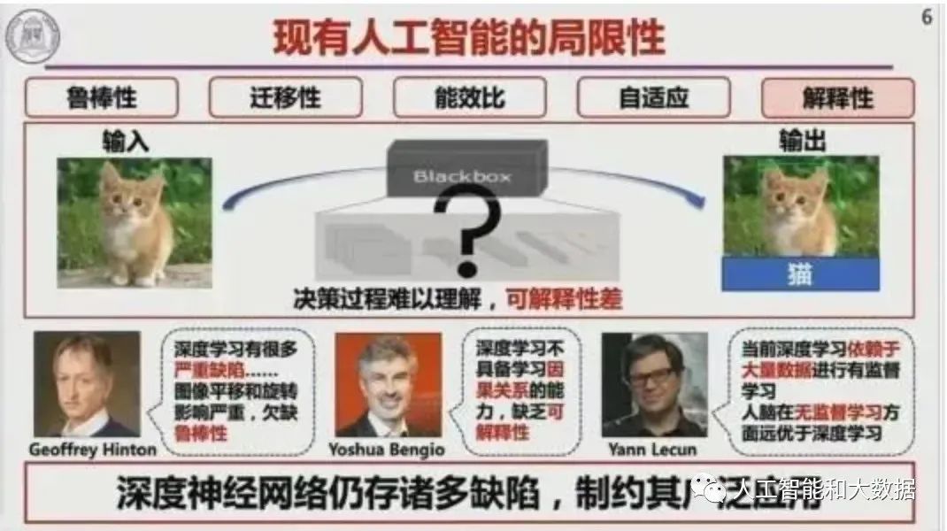 同時,我們更應(yīng)看到人工智能的局限性:其一,自動駕駛領(lǐng)域中人工智能的相關(guān)應(yīng)用,已經(jīng)凸顯了其在魯棒性、遷移性及能效比等方面的問題;其二,在醫(yī)療領(lǐng)域中的應(yīng)用凸顯了人工智能算法自適應(yīng)能力的局限,清華大學跟301醫(yī)院合作,用20萬條男性50歲的腦卒數(shù)據(jù)做訓練,但在做預(yù)測時發(fā)現(xiàn)對女性腦卒疾病的預(yù)測準確度并不高;其三,人工智能可解決一定的問題,但其工作原理還沒有明確的可解釋性。