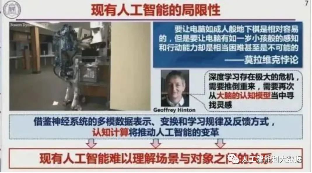 還有一個經(jīng)典案例——莫拉維克悖論。這臺波士頓動力的機器人能翻跟頭、跳舞和干很多復雜的事,但讓它把一個物體放到有障礙物的桌子上去,它做不到,這就是人工智能的問題所在——難以理解場景與對象間的關(guān)系,人工智能能干成年人干的活,但理解能力不如一歲的孩子。