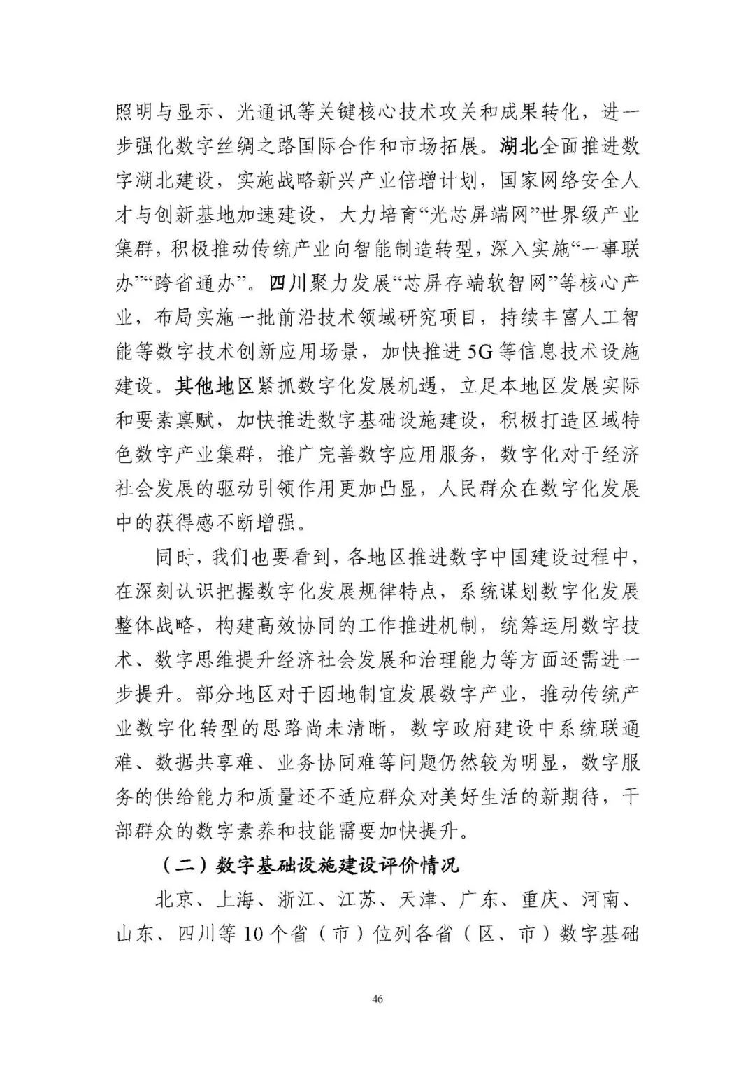 為貫徹落實黨中央、國務(wù)院關(guān)于建設(shè)數(shù)字中國的重要部署,深入實施《國家信息化發(fā)展戰(zhàn)略綱要》《“十四五”國家信息化規(guī)劃》等戰(zhàn)略規(guī)劃,國家互聯(lián)網(wǎng)信息辦公室會同有關(guān)方面跟蹤監(jiān)測各地區(qū)、各部門數(shù)字化發(fā)展情況,開展數(shù)字中國發(fā)展水平評估工作,編制完成《數(shù)字中國發(fā)展報告(2021年)》(以下簡稱《報告》)?!秷蟾妗房偨Y(jié)了黨的十九大以來數(shù)字中國建設(shè)取得的顯著成就和2021年的重要進(jìn)展成效,評估了2021年各地區(qū)數(shù)字化發(fā)展水平,并對2022年數(shù)字中國建設(shè)進(jìn)行了展望?!秷蟾妗啡娜缦拢?
