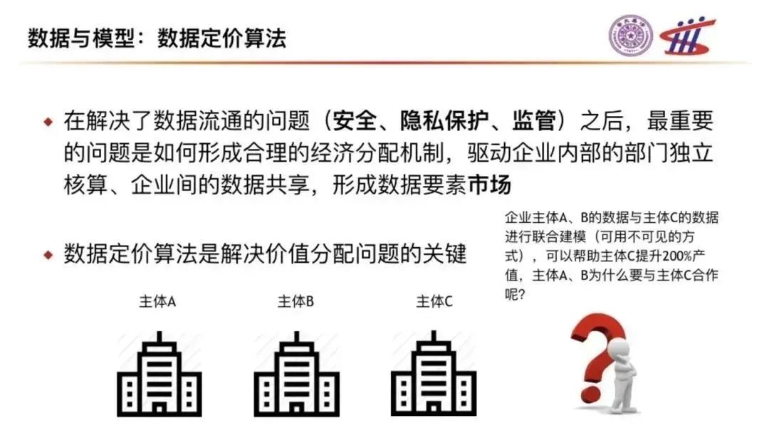要完成這個(gè)任務(wù),我們就需要建立數(shù)據(jù)要素的定價(jià)理論與算法,這是一項(xiàng)融合了信息經(jīng)濟(jì)學(xué)、博弈論、計(jì)算機(jī)科學(xué)的前沿交叉理論,我們?cè)谶@項(xiàng)技術(shù)方面進(jìn)行了前沿研究,并與華潤(rùn)集團(tuán)、華潤(rùn)銀行一道進(jìn)行了實(shí)踐性的探索與落地。我也感謝華潤(rùn)集團(tuán)作為央企的代表,提供了豐富的業(yè)務(wù)場(chǎng)景和數(shù)據(jù)場(chǎng)景,我相信這一試點(diǎn)也會(huì)不斷擴(kuò)大范圍,覆蓋更多的場(chǎng)景與企業(yè),為我國(guó)的數(shù)字經(jīng)濟(jì)發(fā)展提供經(jīng)濟(jì)動(dòng)力。