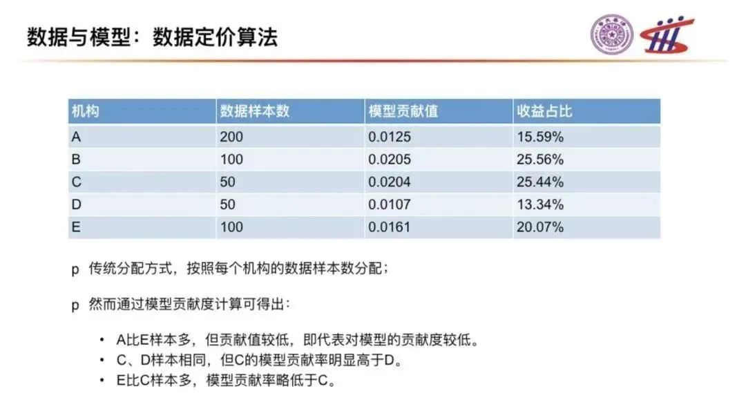 這些經(jīng)濟(jì)效率的提升是基于模型精度的提升,比如精度高一倍的營(yíng)銷模型就可以幫助機(jī)構(gòu)獲得多一倍的業(yè)務(wù)量,這些業(yè)務(wù)的經(jīng)濟(jì)價(jià)值是由于使用了多方的數(shù)據(jù)要素,并建立了更高精度的模型帶來(lái)的。那么我們就可以通過(guò)多方數(shù)據(jù)合作博弈的框架,建立分配算法,按照貢獻(xiàn)度公平合理地分配這些價(jià)值。誰(shuí)的數(shù)據(jù)對(duì)模型精度以及相關(guān)聯(lián)的經(jīng)濟(jì)價(jià)值貢獻(xiàn)度高,誰(shuí)就應(yīng)該獲得相應(yīng)更多的經(jīng)濟(jì)價(jià)值。