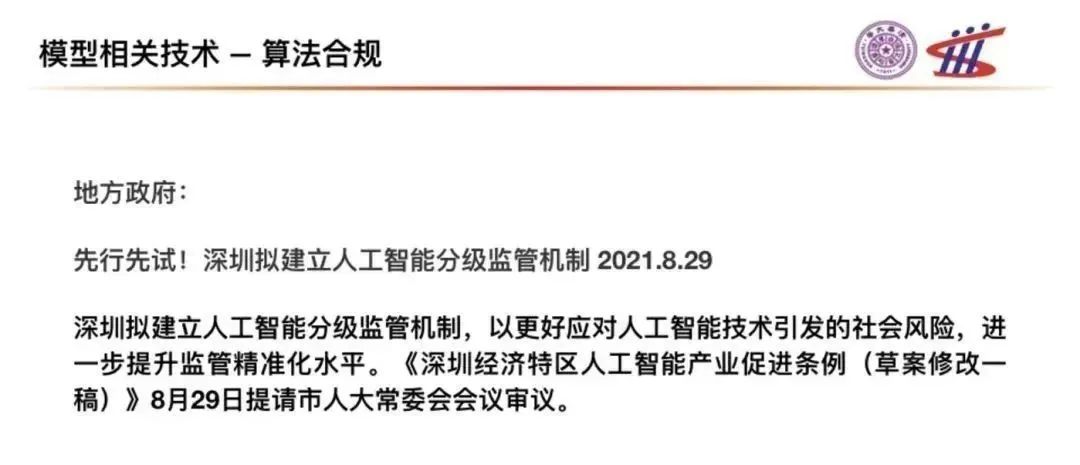 同時(shí)的,模型治理的另一面是算法的合規(guī)性。在數(shù)字經(jīng)濟(jì)時(shí)代,越來(lái)越多的生產(chǎn)活動(dòng)需要依靠算法模型開展,算法與業(yè)務(wù)的深度融合會(huì)是未來(lái)的趨勢(shì),對(duì)于業(yè)務(wù)的合規(guī)性要求也會(huì)傳導(dǎo)到對(duì)算法的合規(guī)性要求。在這方面,我們欣喜的看到深圳市已經(jīng)開始了先行先試,在今年8月份宣布擬建立人工智能分級(jí)監(jiān)管機(jī)制。