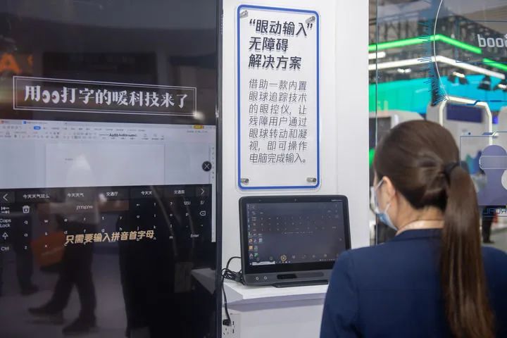 在騰訊公司展區(qū),一款可以用眼睛打字的眼動輸入儀吸引了人們的關(guān)注。儀器能夠精準捕捉用戶的眼球滾動,從而實現(xiàn)打字功能。展會工作人員介紹,對于殘障人士、“漸凍癥”患者等人群來說,通過眼球轉(zhuǎn)動和凝視即可操作電腦完成輸入,眼動輸入儀幫助他們提升了打字效率,使他們的生活更加便利。