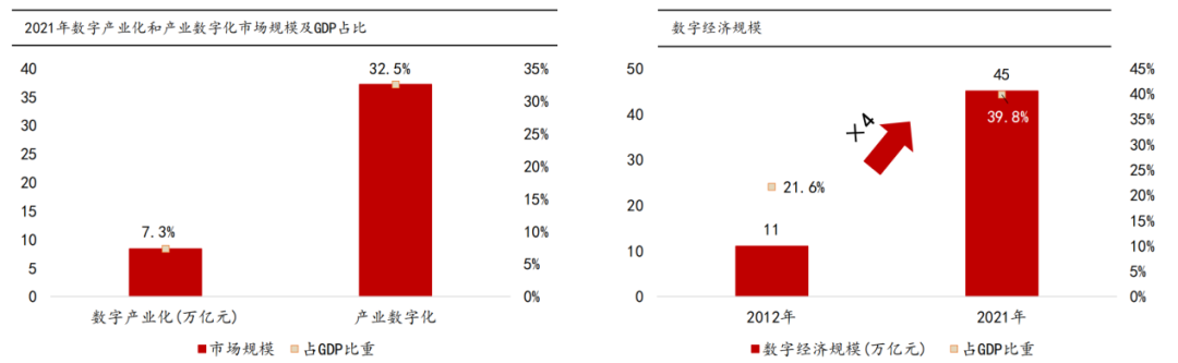 數字經濟規(guī)??焖僭鲩L。2021年,我國數字產業(yè)化規(guī)模和產業(yè)數字化規(guī)模分別為8.35、37.18萬億元。從2012年至2021年,我國數字經濟規(guī)模從11萬億元增長到超45萬億元,數字經濟占國內生產總值比重由21.6%提升至39.8%。