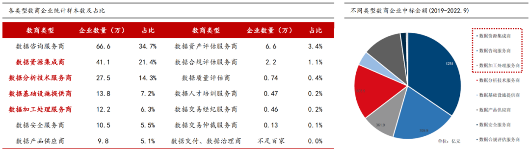 數據資源集成商41萬家,占比約21.4%;數據分析技術服務商27.5萬家,占比約14.3%;數據基礎設施提供商13.8萬家,占比為7.17%;數據加工處理服務商12.2萬家,占比為6.33%。