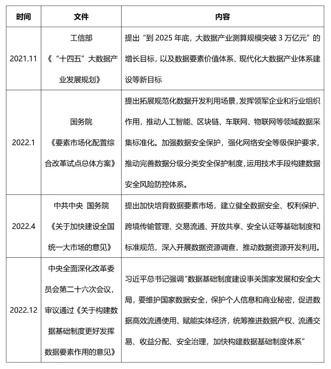 政策方面,中央、地方發(fā)布一系列支持文件,對大數(shù)據(jù)產(chǎn)業(yè)、數(shù)字技術(shù)、數(shù)據(jù)要素市場、數(shù)據(jù)安全等方面進行了重點部署。中央層面,2021年底,《“十四五”大數(shù)據(jù)產(chǎn)業(yè)發(fā)展規(guī)劃》的出臺明確了未來五年大數(shù)據(jù)產(chǎn)業(yè)發(fā)展工作的行動綱領(lǐng)。2022年,黨中央、國務(wù)院先后通過《要素市場化配置綜合改革試點總體方案》、《關(guān)于加快建設(shè)全國統(tǒng)一大市場的意見》、《關(guān)于構(gòu)建數(shù)據(jù)基礎(chǔ)制度更好發(fā)揮數(shù)據(jù)要素作用的意見》等文件,多次強調(diào)了釋放數(shù)據(jù)要素價值對于我國發(fā)展的必要性、緊迫性,為我國大數(shù)據(jù)發(fā)展提供了良好的政策環(huán)境和明確的發(fā)展目標。地方層面,31個?。▍^(qū)、市)均通過發(fā)布大數(shù)據(jù)專題規(guī)劃、數(shù)字經(jīng)濟總體規(guī)劃等形式,明確了各地大數(shù)據(jù)技術(shù)、產(chǎn)業(yè)、應(yīng)用的發(fā)展路線圖、時間表,凸顯出各地在大數(shù)據(jù)布局方面的積極性。