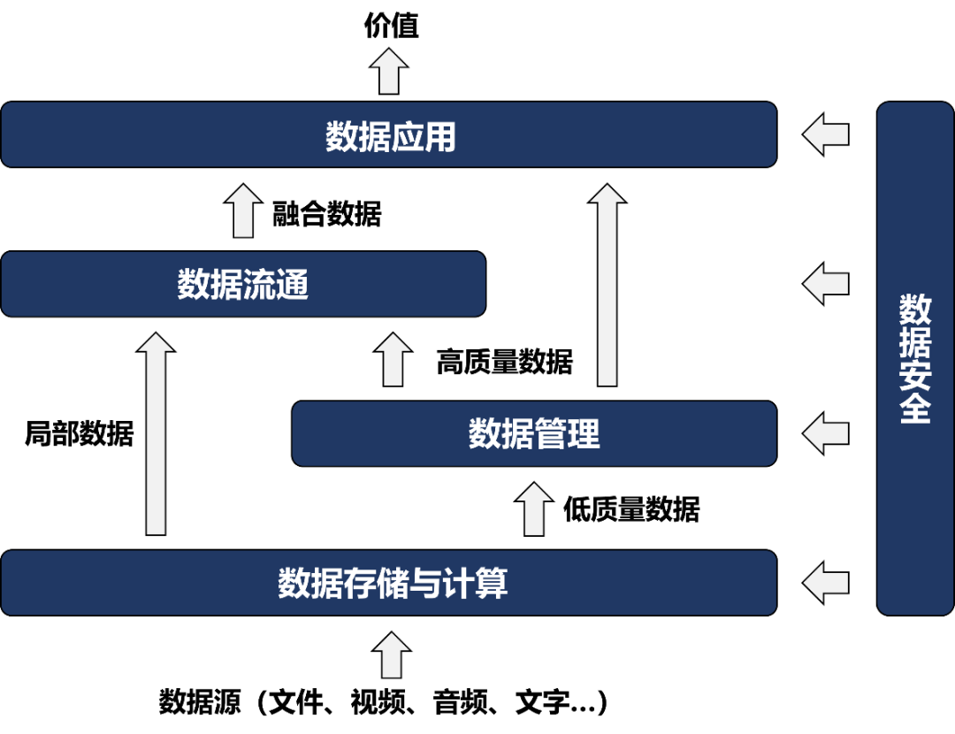 經(jīng)過多年技術(shù)和產(chǎn)業(yè)的發(fā)展,大數(shù)據(jù)領(lǐng)域內(nèi)部逐漸細化,形成數(shù)據(jù)存儲與計算、數(shù)據(jù)管理、數(shù)據(jù)流通、數(shù)據(jù)應(yīng)用、數(shù)據(jù)安全五大核心領(lǐng)域。如圖1所示,數(shù)據(jù)源通過數(shù)據(jù)存儲與計算實現(xiàn)壓縮存儲和初步加工,通過數(shù)據(jù)管理提升質(zhì)量,通過數(shù)據(jù)流通配置給其它相關(guān)主體,通過數(shù)據(jù)應(yīng)用直接釋放價值,并由數(shù)據(jù)安全技術(shù)進行全過程的安全保障。