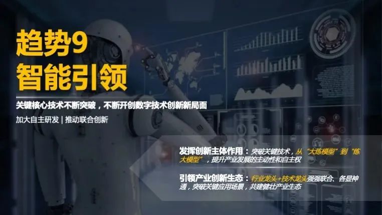 據(jù)了解,國(guó)企數(shù)字化轉(zhuǎn)型的十大趨勢(shì)包括:理念革新,傳統(tǒng)管理方式和體系正在革新,企業(yè)數(shù)字化轉(zhuǎn)型提檔加速;素養(yǎng)提升,數(shù)字化人才隊(duì)伍加速建設(shè),激發(fā)企業(yè)創(chuàng)新動(dòng)力活力;數(shù)據(jù)激活,新要素價(jià)值體系逐步構(gòu)建,加速數(shù)據(jù)資產(chǎn)化進(jìn)程;場(chǎng)景創(chuàng)新,連點(diǎn)成線、聚線成面,不斷催生新業(yè)態(tài)新模式;產(chǎn)業(yè)互聯(lián),數(shù)字化加速融通發(fā)展,不斷拓展產(chǎn)業(yè)協(xié)同新生態(tài);同頻共振,能源革命與數(shù)字革命融合,數(shù)字化賦能綠色低碳;數(shù)實(shí)融合,催生出一批產(chǎn)業(yè)驅(qū)動(dòng)的數(shù)科公司走上舞臺(tái),大大豐富了數(shù)字化供給能力;強(qiáng)基賦能,數(shù)字基礎(chǔ)設(shè)施建設(shè)和規(guī)模化應(yīng)用加快,數(shù)字經(jīng)濟(jì)底座更加堅(jiān)實(shí);智能引領(lǐng),關(guān)鍵核心技術(shù)不斷突破,不斷開(kāi)創(chuàng)數(shù)字技術(shù)創(chuàng)新新局面;安全護(hù)航,網(wǎng)絡(luò)防護(hù)體系強(qiáng)化可信可控,筑牢數(shù)字空間安全屏障。