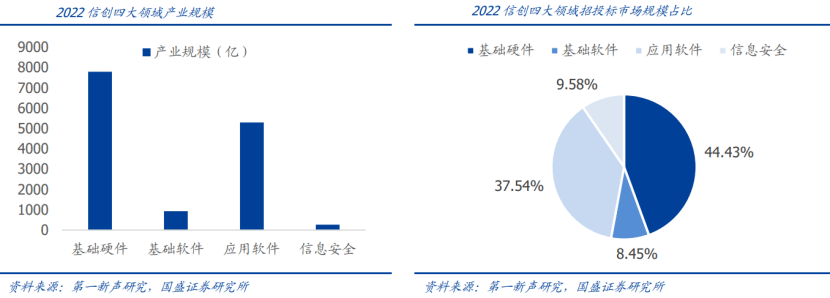 四大領(lǐng)域全面覆蓋,萬億市場空間巨大。信創(chuàng)產(chǎn)業(yè)是我國數(shù)字化轉(zhuǎn)型的重要組成部分,也是關(guān)鍵基礎(chǔ)設(shè)施的重要支撐。其全面覆蓋基礎(chǔ)硬件、基礎(chǔ)軟件、應(yīng)用軟件、信息安全四大領(lǐng)域。