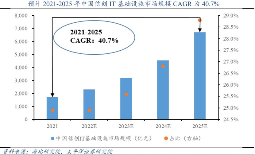 IT 基礎(chǔ)設(shè)施是信創(chuàng)事業(yè)的絕對核心,預(yù)計為信創(chuàng)產(chǎn)業(yè)體系中增速最快的環(huán)節(jié)。作為信創(chuàng)的核心、最底層與基礎(chǔ)的環(huán)節(jié),IT 基礎(chǔ)設(shè)施預(yù)計為整個國產(chǎn)替換浪潮中最先替換的部分。根據(jù)海比研究院數(shù)據(jù),2022 年中國信創(chuàng) IT 基礎(chǔ)設(shè)施規(guī)模為2299.1 億元,2021-2025 年復(fù)合增長率約為 40.7%,預(yù)計為信創(chuàng)增速最快的產(chǎn)品;在市場占比方面,IT 基礎(chǔ)設(shè)施占據(jù) 1/4 的市場份額,并且在持續(xù)增加,預(yù)計到 2025年占比將達到 28.8%。憑借 IT 基礎(chǔ)設(shè)施的核心地位及快速增長的良好勢頭,將為信創(chuàng)市場的發(fā)展奠定良好的開端。