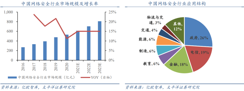 信創(chuàng)背景下網(wǎng)絡(luò)安全在行業(yè)領(lǐng)域發(fā)展或?qū)⑻崴?,整體呈現(xiàn)重硬件輕軟件趨勢。在“十四五”和二零三五的整體規(guī)劃下,以及部分違法處理個人信息事件的發(fā)生,使得網(wǎng)絡(luò)安全的重要性提升。網(wǎng)絡(luò)安全領(lǐng)域,硬件和軟件產(chǎn)品均有垂直廠商布局,“雙輪驅(qū)動”布局優(yōu)勢明顯,2022 年我國網(wǎng)絡(luò)安全行業(yè)市場規(guī)模約為700 億元左右。根據(jù)億歐統(tǒng)計數(shù)據(jù),政府端網(wǎng)絡(luò)安全產(chǎn)品滲透率已超過 1/4,電信、金融領(lǐng)域?qū)⒔?1/5,其他行業(yè)領(lǐng)域網(wǎng)絡(luò)安全仍有較大發(fā)展空間。