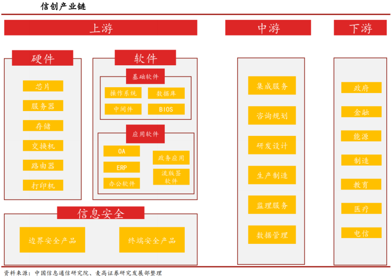 信創(chuàng)產(chǎn)業(yè)體系龐大,從產(chǎn)業(yè)鏈角度,主要由基礎(chǔ)硬件、基礎(chǔ)軟件、應(yīng)用軟件、信息安全四部分組成。其中基礎(chǔ)硬件主要包括芯片、服務(wù)器、存儲等;基礎(chǔ)軟件則主要包括操作系統(tǒng)、數(shù)據(jù)庫和中間件;應(yīng)用軟件主要包括辦公軟件和各行業(yè)軟件。其應(yīng)用領(lǐng)域包括政府、金融、能源、制造、教育等領(lǐng)域。
