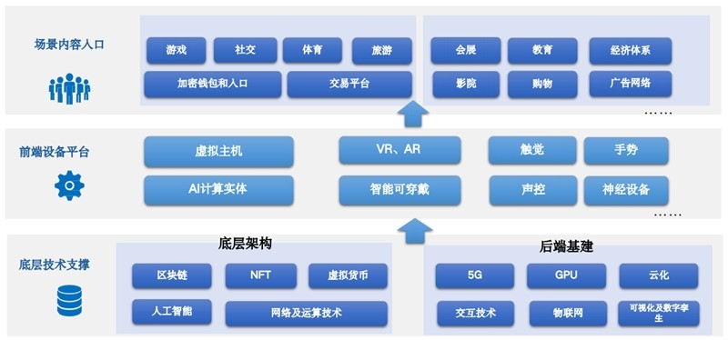 首先,提供元宇宙體驗(yàn)的硬件入口(VR/AR/MR/腦機(jī)接口)及操作系統(tǒng),其次是支持元宇宙平穩(wěn)運(yùn)行的后端基建(5G/算力與算法/云計(jì)算/邊緣計(jì)算)與底層架構(gòu)(引擎/開(kāi)發(fā)工具/數(shù)字孿生/區(qū)塊鏈),再次是元宇宙中的核心生產(chǎn)要素(人工智能),最終呈現(xiàn)為百花齊放的內(nèi)容與場(chǎng)景,以及元宇宙生態(tài)繁榮過(guò)程中涌現(xiàn)的大量提供技術(shù)與服務(wù)的協(xié)同方。