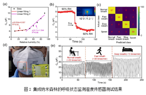 為了解決以上問題,團(tuán)隊提出了可用于呼吸狀態(tài)監(jiān)測的三層結(jié)構(gòu)MEMS濕度傳感器,該器件由濕敏電容、參比電容、微加熱器和熱敏電阻四部分構(gòu)成。該傳感器通過原位集成納米森林作為濕敏材料,大幅提高了檢測靈敏度;參比電容的使用降低了環(huán)境干擾和寄生電容對測試結(jié)果的影響;熱敏電阻用于測試環(huán)境溫度為傳感器提供溫度補(bǔ)償依據(jù),減小了檢測誤差;微加熱器加電壓后溫度升高,可加速納米森林上水分子的解吸附,縮短恢復(fù)時間。利用該傳感器高靈敏度、響應(yīng)/恢復(fù)速度快、高精度和抗干擾能力強(qiáng)的特點(diǎn),進(jìn)一步開發(fā)了具有無線傳輸功能的運(yùn)動狀態(tài)監(jiān)測模塊,當(dāng)將其置于口罩中時,就能夠通過呼吸數(shù)據(jù)來區(qū)分佩戴者的運(yùn)動狀態(tài)。在機(jī)器學(xué)習(xí)算法的輔助下,該傳感器對佩戴者不同運(yùn)動狀態(tài)的識別準(zhǔn)確率高達(dá)94%。該傳感器有望在消費(fèi)電子和生物醫(yī)療領(lǐng)域獲得廣泛應(yīng)用。
