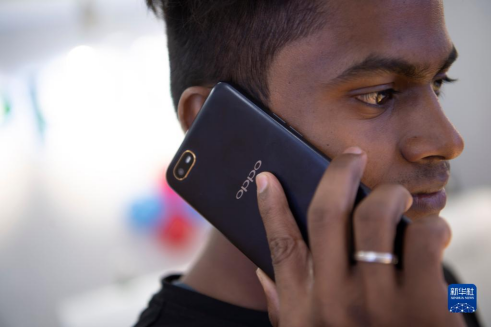 2019年10月8日,一名男子在印度金奈的一家商場(chǎng)使用中國(guó)品牌的手機(jī)。