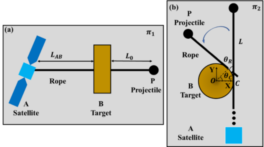 圖1.衛(wèi)星通過系繩彈丸系統(tǒng)纏繞捕獲目標對象的示意圖。(a)衛(wèi)星A、目標對象B和B的縱向方向確定的平面π1;(b)衛(wèi)星A、目標對象B和B的橫截面確定的平面π2 。